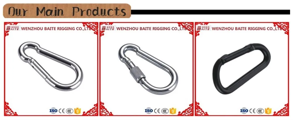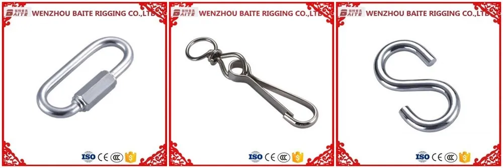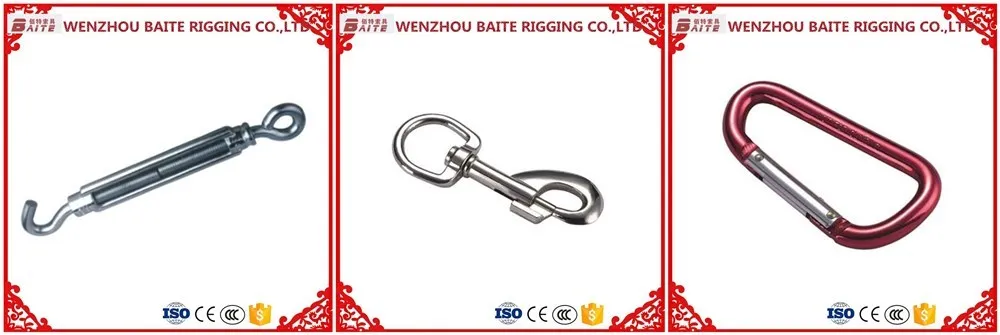 Our main products range from rigging hardware such as quick link, all types snap hook, aluminum hook, swing hook, dog ring, Dee ring or round ring, 8 shaped and S shaped hook, turnbuckle, shackle, pulley, screw, nut, pad, and buckle to other fastening hardware etc,