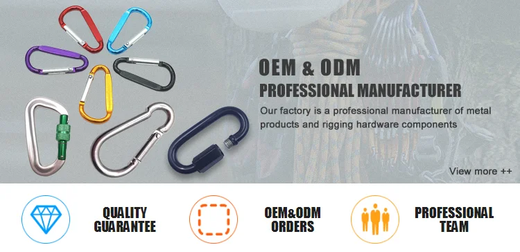 Wenzhou Baite Rigging Co., Ltd. was established in 2005, is a professional manufacturer engaged in research,development, production, sale and service of snap hook, quick link, S hook, aluminum carabiner, rigging and otherhardware. We're famous for product quality, competitive price, frst-class craftworks, safe package and promptdelivery. We're located in Wenzhou, Zhejiang Province, enjoying convenient transportation and beautiful environmentThe factory covers an area of 2200 square meters and has 81 employees. Dedicated to strict quality control andthoughtful customer service, our experienced staff can always discuss your requirements and ensure customersatisfaction.in recent years, our company has introduced a series of advance equipment including Cold Heading Machine, Punching Machine, Automaton Machine, Hydraulic Machine, and Cutting Machine. Our company pays attention to product quality. The company has strict quality control from the procurement of rawmaterials to the sale of finished products, At the same time, our company has established a quality managementsystem, and the system complies with international standards, We also welcome O D M and O E M orders. Weatherselecting a current product from our catalog or seeking engineering assistance for your application, you could talk to our Customer Service Center about your sourcing requirement, We warmly welcome customers from at home anaabroad to cooperate with us for common success. We believe that our company wil win your recognition with satisfactory product quality and perfect after-sales service.